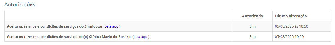 Na seção "Autorizações", você vê se aceitou os termos de uso:
