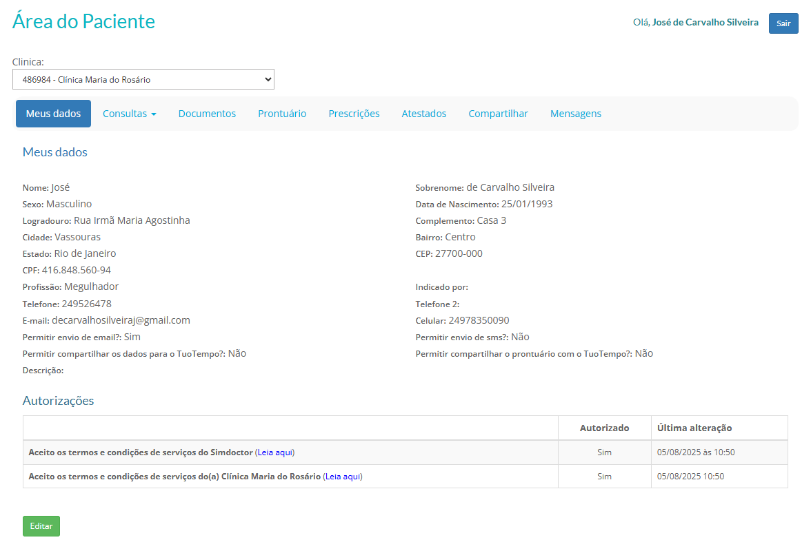 Neste momento, está sendo exibido a Área do paciente. Essa tela faz parte do portal online da clínica e permite que você visualize e gerencie suas informações pessoais.