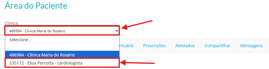 Caso você tenha vínculo com mais de uma clínica, selecione a desejada para ver os dados correspondentes.
