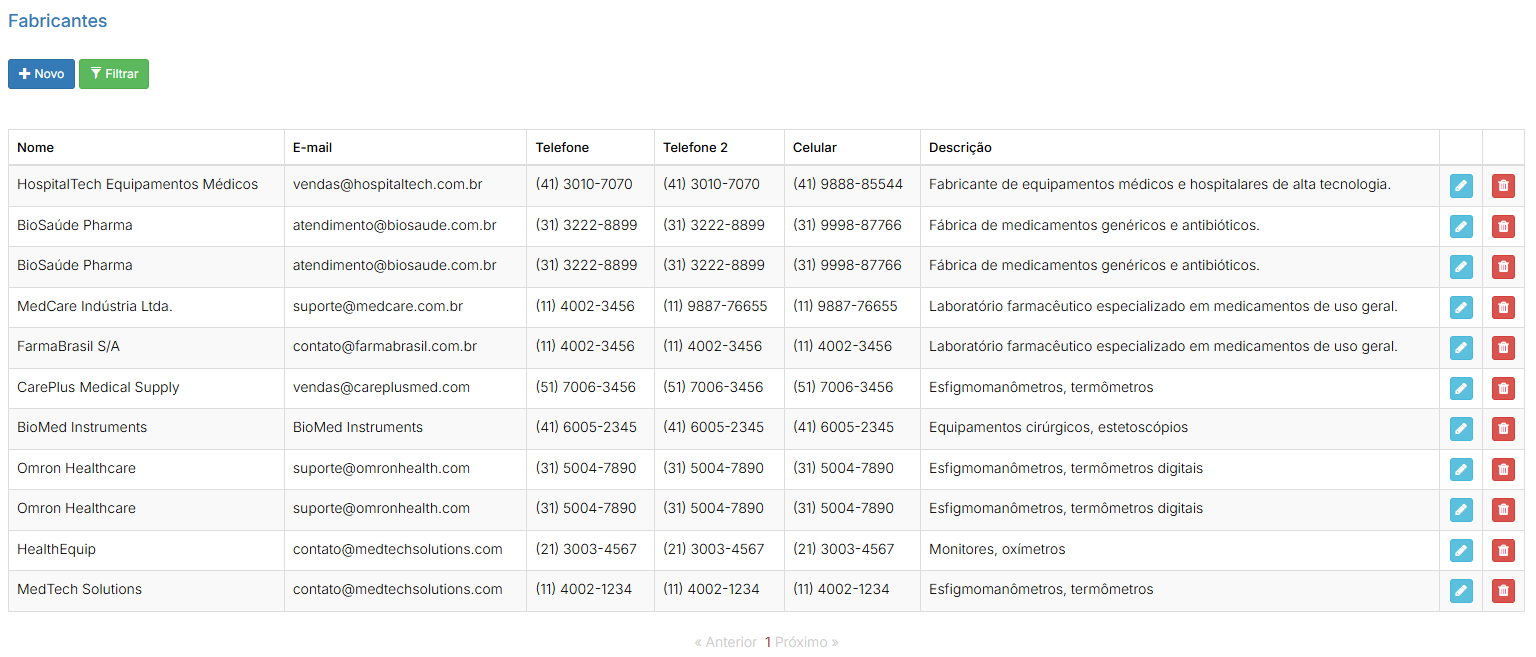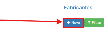 Abaixo o botão azul Novo permite adicionar um novo fabricante e o botão verde Filtro permite pesquisar os fabricantes cadastrados no sistema.