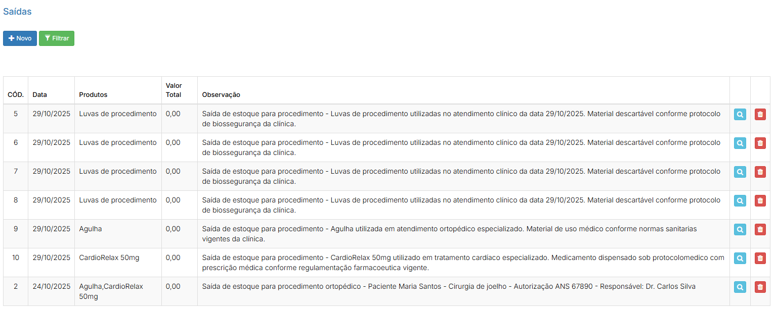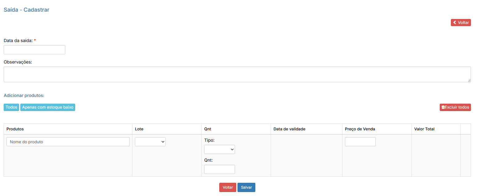 Preencha todos os campos e clique no botão azul Salvar. Após, as informações serão salvas no sistema e será exibido a lista de saída de produtos.