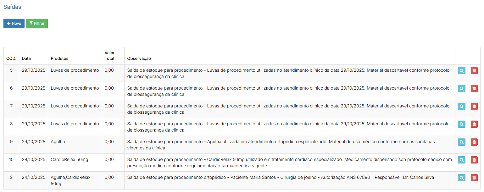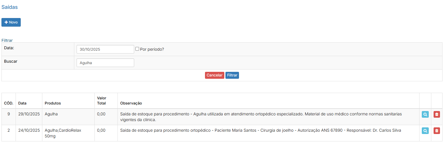 Veja que o cadastro de Saíde de protudos está sendo exibido, na imagem abaico: